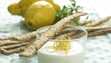 Rør alle ingredienserne sammen til en glat dej og rul den ud mellem to stykker bagepapir på en bageplade. Fjern det øverste stykke bagepapir og skær dejen for med en kniv i tynde dejstrimler. Bag strimlerne midt i ovnen ved 200° i 15 min., til de er gyldne. Rør cremefraichen med citronsaft og -skal, smag til med salt og peber og server.