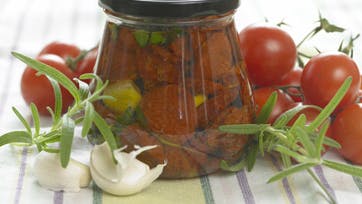 Halver tomaterne og læg dem spredt ud på en bageplade. Tør tomaterne i ovnen ved 120° i 3 timer, til vandet er fordampet, og lad dem køle af. Kom tomaterne i et rengjort, skoldet henkogningsglas sammen med krydderurter og peberkorn. Hæld olien over tomaterne og lad dem trække i mindst 1 døgn før brug.