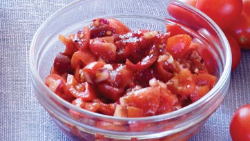 Udkern tomater og peberfrugt og skær selve frugtkødet i små tern. Hak løget fint. Rør resten af ingredienserne sammen og vend løg, tomat og peberfrugt i marianden. Server med fladbrød og en tzatziki. Begge dele medbringes i bøtter med holdbare lukkede låg.