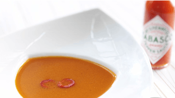Varm olie på panden og svits løgene, til de er bløde, men ikke brune. Tilsæt tomater skåret i grove stykker og peberfrugter og svits, til de også er bløde. Hæld bouillonen i og lad det koge op. Simrer med låg på ved lav varme i 20 min. Hæld suppen gennem en si ned i en gryde. Sørg for ikke at mase grønsagerne igennem, det vil gøre suppen uklar. Smag til med salt, peber og Tabasco. Lad suppen koge op igen. Server i en skål og pynt med chili skåret i skiver.