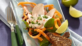 Skyl rognen. Kog lagen op og læg rognen i. Kog den ganske småt ca. 8 min. Sluk for varmen og lad rognen trække 10-12 min. under låg i kogevandet. Skræl gulerødderne og høvl dem i strimler med kartoffelskræller. Skyl og tør salaten. Flæk rognen og spis den varm med rugbrød, gulerodsstrimler, salat, tatarsauce og limebåde.