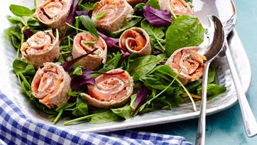 Smør osten på tortillaerne og læg ørredskiverne over. Rul tortillaerne sammen og skær dem i skiver. Anret skiverne på en bund af blandet salat og servér.