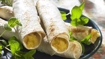 Køl det lidt af og bred frugten ud på tortillaerne. Rul dem sammen. Læg rullerne på bagepapir på en bageplade. Pensl med æg og drys sukker på. Sæt dem øverst i en 225° varm ovn 4-5 min., til de begynder at få lidt farve.
