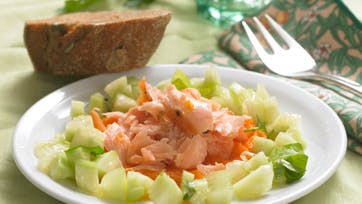 Agurkesalat: Skræl og halver agurken. Skrab kernerne ud. Skær agurk og æble i små tern og bland det med citronsaft og salt. Skær myntebladene i fine strimler. Fjern lakseskindet og del kødet i mindre stykker. Bland agurkesalaten med mynte og olie lige inden serveringen. Læg en skefuld puré i små skåle eller tallerkner. Fordel laksen og pynt med agurkesalat. Spis grovflutes til.
