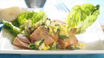 Hak æggene og bland dem med kapers og forårsløg. Riv citronskallen og bland med citronsaft og olivenolie. Smag til med salt og peber. Del ørreden i mindre stykker og anret dem portionsvis med salat, æg, kapers, forårsløg og tomat. Dryp dressingen over og pynt med dild. Server med ristet rugbrød eller flute.