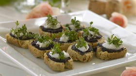 Fordel tapenade og gedeost på skorperne og pynt med karse.