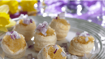 Stik 36 cirkler på 3 cm ud af butterdejspladerne, læg 12 af dem på en bageplade og pensl dem med mælk. Læg de sidste 24 cirkler sammen to og to til 12 cirkler i dobbelt tykkelse. Udstik et 1½ cm stort hul i hver af dobbeltcirklerne og læg dem på de penslede cirkler. Bag vol-au-vent'erne ved 200° i 15 min. og lad dem køle helt af. Fordel cremefraichen i vol-au-vent'erne, læg stenbiderrognen over, pynt med de hakkede rødløg og server.