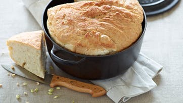 Hæld dejen ud på et melet bord og fold den over et par gange, først på langs og så på tværs. Læg dejen i en olieret skål og lad den hæve yderligere 2 timer. Varm en gryde, gerne støbejern, op i ovnen ved 250° i ca. 30 min. Tag den varme gryde ud og lad dejen glide ned i gryden. Sæt gryden i ovnen med låg på og bag brødet 30 min. Tag låget af og sænk temperaturen til 225°. Bag yderligere 15 min. Tag gryden ud af ovnen og vip brødet over på en rist. Lad det afkøle mindst 2 timer.