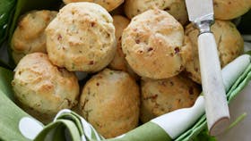 Rør flødeost, mælk og æg sammen og bland mel og bagepulver. Rør mælkeblandingen i melet til en glat dej og vend løg, bacon og persille i.