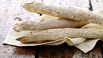 Udrør gær i vand og salt. Kom halvdelen af melet i på en gang og tilsæt så meget mel, at dejen stadig er let klistret, men dog kan slippe fingrene. Gør evt. dette på maskine. Lad den hæve 4 timer lunt. Slå dejen ned og fold (som kuvert) 4-5 gange. Lav en slags bradepandekage (uden form) på et meldrysset bord og lad den hæve igen tildækket gerne med klæde og film i 2 timer. Del i 3 lange baner og tril til flutes. Forvarm ovnen til 250°. Læg evt. brødene i fluteforme og drys med mel, rids evt. overfladen. Skru ned til 225°, sæt en skål med vand i bunden af ovnen og bag i ca. 20 min.