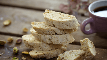 Rist mandler og pistacienødder på en tør pande, til de begynder at tage farve, og hak dem groft. Rør æg, sukker og vaniljesukker sammen og bland nødderne i. Bland mel, bagepulver og salt, kom det i æggeblandingen og saml dejen. Del dejen i to og rul hver del til en ca. 25 cm lang pølse og læg dem, med god afstand, på en plade med bagepapir. Bag stængerne ved 160° i 30 min. og lad dem køle lidt. Skær stængerne i 1 cm tykke skiver på skrå og bag dem endnu 15 min. Lad kagerne afkøle helt på en bagerist og kom dem i en kagedåse.