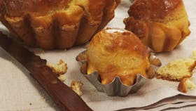 Del dejen i 10 stykker, der trilles til kugler, hvoraf der tages en tredjedel fra hver. Kom bollerne i smurte briocheforme, der også kan erstattes af store linseforme eller bagepapirforede, rensede metaldåser. Den sidste tredjedel trilles til en mindre kugle og trykkes i bollens midte. Her hæver dejen igen 30 min., inden den pensles med æg. Bages ved 220° i 15-20 min.