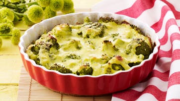 Hæld vandet fra, blend den til en glat puré og rør æg, ost, salt og peber i. Kom broccolibuketterne i et smurt tærtefad og fordel æggeblandingen over.