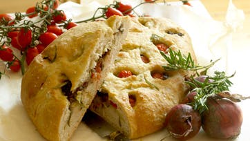 Del dejen i to og form det til rektangler ca. 25 cm lange. Læg det på bagepapir og skær brødet over diagonalt, så man får fire trekanter. Skær så nogle krydssnit, hvori du stopper resten af løgene, tomater og rosmarin. Pensl med olie og drys med groft salt. Efterhæv i 15 min. og bag ved 225° i 20 min. Server som appetizer evt. med et glas tør sherry.
