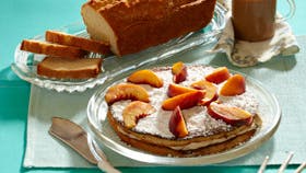 Fyld: Pisk fløden stiv med sukker og kaffe. Læg bundene sammen med fyldet, sigt flormelis over og læg nogle både af frisk frugt på toppen. Stil kagen koldt, til den skal serveres.