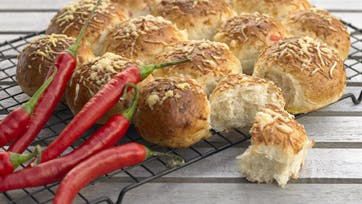 Flæk chilierne, fjern kernerne og hak chilierne fint. Smuldr gæren og rør den ud i vandet. Tilsæt chili, sukker, salt, ost og mel. Ælt dejen smidig på ca. 5 min. Hæver lunt tildækket 40 min. Læg dejen på meldrysset bord og del den på midten. Del hvert stykke i 15 og tril dem til små boller. Læg bollerne i en cirkel eller firkant med lidt plads mellem hver på 2 plader med bagepapir. Efterhæver tildækket 30 min. Pensl med æg og drys ost på. Bag bollerne på midterrillen ved 225° ca. 15 min.