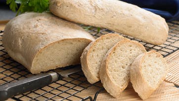 Dej: Rør vand, salt og mel i fordejen. Dejen er blød, og det er bedst at ælte den på maskine, men den kan også æltes med melede hænder ved at løfte op i dejen fra skålens bund. Dejen skal være meget elastisk. Lad den hæve lunt tildækket til dobbelt størrelse ca. 2 timer. Mens dejen stadig er i skålen, halveres den med en kniv eller saks. Hæld først den ene del ud på bageplade med bagepapir og glat den med dejskraber uden at ælte. Efterhæver tildækket 30-45 min. Drys mel over og sæt pladen på nederste rille ved 225° 30-35 min. Afkøles på rist.