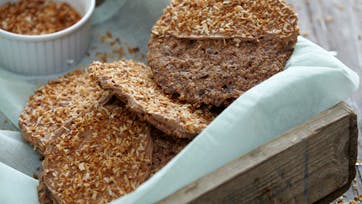 Rør smør, sukker, havregryn, mel og mørk chokolade sammen og tril blandingen til 8 kugler. Tryk kuglerne let flade på en plade beklædt med bagepapir og bag dem ved 180° i 10-15 min. Lad kagerne afkøle helt på en rist og smelt den lyse chokolade. Dyp halvdelen af hver kage i chokolade og drys med kokos.