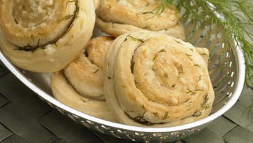 Hak dilden og bland den med blødt smør og citronsaft. Rul dejen ud på meldrysset bord i ca. 40 x 50 cm. Bred fyldet på og rul dejen sammen som roulade. Skær den i 20 skiver og læg dem på plade med bagepapir med skæresiden opad. Efterhæver tildækket 20 min. Pensl sneglene med æg og drys salt på. Bag dem midt i ovnen 10-12 min. ved 225°.