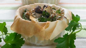 smør. Læg i alt 3 lag dej i hver ramekin med smør mellem hvert lag. Bland ris, hakket artiskok, oliven, lidt af persillen og feta og kom det i hver ramekin. Det kan laves dagen før og stilles på køl. Bag det ved 180° i 10-15 min. Drys med persille og server.
