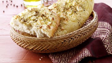 Rør gær med sukker og vand. Kom salt, yoghurt og olie i og tilsæt så melet lidt ad gangen, mens du ælter. Ælt i 5-10 min. Lad dejen hvile til dobbelt størrelse. Slå dejen ned og del den i to. Rul den ud til to aflange stykker, på hvis midte der drysses feta og pensles med æg. Kanterne foldes over og lukkes på midten. Pensles med olie og bages i ovnen på pizzasten, hvis du har en sådan, ellers bare på plade ved 210° i 10-12 min., til det er lysebrunt. Holdes bløde pakket i et rent klæde.