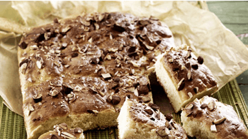Rør gæren ud i vandet. Hak smørret i melet og ælt sammenpiskede æg, citronskal, sukker og gærvand i melhakket, der formes som en lille vulkan, så det kan rumme det flydende. Lad dejen hæve koldt natten over. Hæld den ud i en smurt bradepande på 25x 35 cm og lad den hæve 20 min. Pynt med hakkede mandler, skær for, så der dannes 16 stykker brød og bag ved 210° i 15 min. midt i ovnen. Serveres nybagte til morgenbordet.