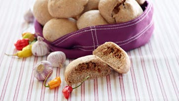 Rør gæren ud i vandet og tilsæt salt, olie, speltmel og klid. Kom hvedemelet i, ælt dejen godt igennem og lad den hæve i 45 min. Brun kød og løg i en gryde, tilsæt salt, presset hvidløg, kommen, tomatpuré og chili og lad den afkøle lidt. Del dejen i 16 stk. og tryk dem flade. Fordel kødet på dejstykkerne og luk dejen sammen om fyldet. Lad bollerne efterhæve i 20 min., pensl med vand og drys med ost. Bag bollerne i ovnen ved 190° i 25 min. og server.