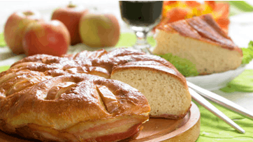 Rør gær og vand sammen. Tilsæt æg, sukker, salt, revet ost og mel lidt ad gangen. Ælt dejen godt og lad den hæve tildækket og lunt 45 min. Dæk bunden af stegepanden med baconskiver. Ælt dejen let igennem og form den til et rundt, fladt brød. Del æblet, fjern kernehuset og skær æblet i tynde både. Stik dem ned i brødet. Lad brødet efterhæve 30 min. Bag det på nederste rille ved 200° ca. 30 min. Lad brødet køle nogle min., inden det løftes over på et bræt. Spis det lunt.