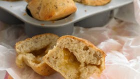 Rør gæren ud i mælken og hak smørret i melet. Bland nødder og sukker i melet, tilsæt mælk og æggeblommer og ælt dejen glat. Lad dejen hæve i 30 min. og rør marmeladen med citronskal og rom. Fordel halvdelen af dejen i 24 små smurte forme og læg en skefuld marmelade over. Fordel resten af dejen over marmeladen, pensl med mælk og bag dem ved 190° varmluft i 20 min.