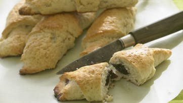 Rør smør og sukker godt. Tilsæt æg og mælk. Bland mel og bagepulver og kom det i dejen. Ælt den sammen. Del dejen i 4 stykker, rul hvert stykke til en cirkel 2-3 mm tyk og skær den i 6 trekanter. Læg omkring ½ tsk. marmelade på hver trekant og rul dem sammen. Læg giflerne på plade med bagepapir og snippen nedad. Pensl med æg og bag dem på midterrillen ved 225° ca. 10 min.