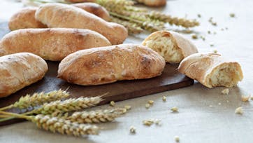 Hæld dejen ud på et melet bord og form et rektangel. Del dejen på tværs med dejskraber i brede strimler og så hver strimmel på langs i lidt skrå stykker. Læg stykkerne på plade med bagepapir og drys lidt mel over. Sæt pladen midt i ovnen ved 250°. Spray godt med vand ind i ovnen, så der dannes damp, og brødene bliver sprøde. Bag brødene 15-20 min. og køl dem af på en rist.