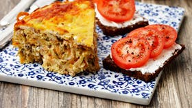 Fordel massen i en smurt springform, drys med resten af cheddarosten og bag tærten i ovnen i ca. 40 min.