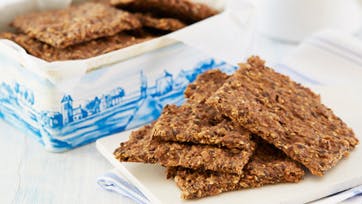 Sæt pladen tilbage i ovnen og bag yderligere 55-60 min., til knækbrødene er tørre og gyldne.
