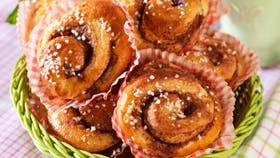 Rul dejen ud i en ca. 60 x 20 cm stor plade. Fordel fyldet på dejen og rul den sammen som en roulade. Skær den i ca. 20 skiver og lad dem hæve tildækket i ca. 40 min. Pensl med sammenpisket æg, drys med perlesukker og bag sneglene ved 255° i ca. 8-10 min.