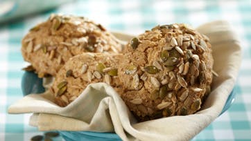 Rør gæren ud i vandet og tilsæt salt, sirup, rugmel og havregryn. Rør melet i og fordel dejen i to fryseposer. Læg poserne på køl i mindst 8 timer, de kan dog sagtens ligge der i 4-5 dage. Bland græskarkerner og solsikkefrø og klip poserne op. Form 10 boller af hver pose dej, brug evt. en ske og rul dem i kerner. Sæt dem på en plade med bagepapir og bag dem ved 200° i 30 min.