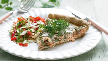 Bland mel, olie og salt og saml dejen med vandet. Rul dejen ud og læg den i en 26 cm stor tærteform. Prik bunden med en gaffel og bag den midterst i ovnen ved 175° varmluft i 10 min. Pisk æg og fløde sammen med tomatpure og tilsæt presset hvidløg, dild, salt og peber. Skær fisken i mundrette stykker og fordel dem og rejerne i den forbagte tærtebund. Hæld æggemassen over og bag tærten midterst i ovnen ved 180° varmluft i 45 min.