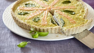 Kom de to slags mel, smør og salt i en blender og saml til en fast dej med lidt vand, eller saml dejen i en skål. Beklæd en tærteform med dejen og læg alufolie over dejen. Forbag bunden ved 200° i 10 min. Fjern alufolien. Tag lidt basilikumblade fra til pynt, hak de øvrige blade fint. Blend den ferske laks med lidt af hytteosten og rør æggene i. Kom resten af hytteosten og de hakkede basilikumblade i. Smag til med salt og peber, kom massen i den forbagte bund. Dekorer med strimler af røget laks og hele basilikumblade. Bag ved 180° i 25-30 min., til den er fast og gylden. Server lun med salat til.