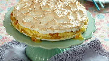 Hak smørret i melet, tilsæt sukker og saml dejen let med fløden. Rul dejen ud til en cirkel og læg den i bunden af en 24 cm's springform. Prik bunden med en gaffel og bag den ved 200° i 15 min. Pisk æg, sukker, majsstivelse, fløde og vaniljesukker sammen og kog cremen igennem, mens der piskes. Hæld cremen på tærtebunden og fordel marmeladen over. Pisk æggehviderne stive, pisk sukker og eddike i og fordel marengsen over bunden. Bag tærten i yderligere 25 min. ved 150°, til den er gylden, og servér.