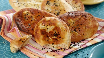 Opløs gæren i vandet og rør mælk, æg og salt i. Tilsæt melet, ælt dejen godt igennem, til den er helt glat, og stil den til hævning i 45 min. Del dejen i 12 stk., rul dem flade og læg dem på en plade med bagepapir. Bland olien med presset hvidløg, pensl brødene med olien og sæt dem under grillen i ovnen i 2-3 min., til de er let gyldne. Vend brødene, pensl med olie, drys med nigellafrø og grill dem i yderligere 2-3 min.