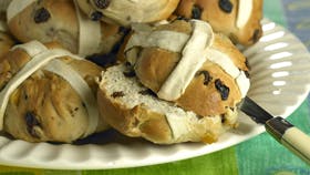 Bland vand, mælk, gær og sukker. Gnid smørret i melet og tilsæt salt og krydderier. Kom gærblandingen i melblandingen og ælt. Mere vand eller mel kan tilsættes om nødvendigt. Kom frugt i og ælt i 10 min., til dejen er glat og smidig. Smør dejen med olie og lad den hæve i skålen dækket med plastfilm i 1½ time. Slå dejen ned og form 18 boller. Lad dem hæve 30 min. tildækket. Til pynt blandes melet med så meget vand, at det kan formes. Lav smalle strimler af melmassen. Rør sukker med vand og pensl bollerne hermed og læg så melstrimlerne over, så de symboliserer kristi kors. Bages ved 200° i 15 min. Afkøles og spises med smør.