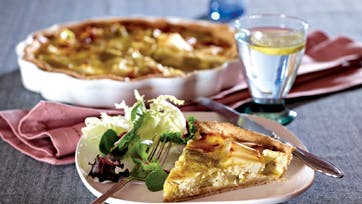 Kom mel, groft mel og smør i en foodprosser og blend, kom lidt vand i til en fast dej. Rul dejen ud og beklæd en tærteform med den. Prik tærten med en gaffel og læg alufolie på kanten og forbag tærten 10 min. ved 200°. Rist bacon. Blancher porreringene og læg dem på tærten med baconternene. Rør æg, tykmælk, salt og peber sammen og kom det over tærten og drys med ost. Bag tærten ved 200° i 25-30 min. Serveres lun med salat.