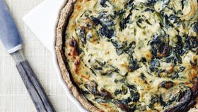 Spinatfyld: Skyl spinaten grundigt i flere hold koldt vand og fjern de groveste stilke. Pil løg og hvidløg. Skær løg i tynde både og skær hvidløg i tynde skiver. Opvarm en stor pande med olie og steg løget ved middel varme i et par min. Tilsæt spinaten og lad den falde sammen. Tilsæt hvidløg, skru op for varmen og lad det hele stege i 4-5 min., til spinaten har smidt meget af vandet. Krydr med salt og peber. Kom spinaten i en si og lad den sidste væde dryppe fra. Pisk gedeost, yoghurt, æg, salt og peber sammen og vend den afdryppede spinat i. Fordel fyldet oven på tærtebunden og bag tærten i ovnen i 35-40 min.