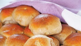 Smelt smørret og hæld mælken i. Lad det køle og rør gæren ud i mælken. Skræl æblerne og fjern kernehuset, skær dem i små stykker. Rør æbler, salt, sirup og fuldkornsmel i. Ælt hvedemelet i lidt ad gangen og ælt til en blank og smidig dej. Lad dejen hæve tildækket 30 min. Ælt dejen igennem og form ca. 20 boller, lad dem efterhæve på en papirbeklædt plade i ca. 30 min. Bag bollerne ved 225° i ca. 12 min.