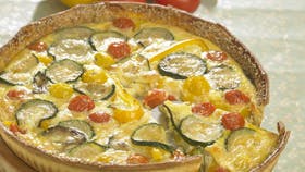 Fyld: Rør gedeost, cremefraiche og æg sammen. Krydr med salt og peber. Skær courgetten i skiver og steg dem gyldne på panden i olien. Udkern peberfrugten og skær den i små stykker. Hæld ostefyldet i den forbagte tærte. Læg courgetter, peberfrugt og hele tomater på osteblandingen. Bag tærten på midterrillen ca. 30 min. ved 200°.