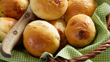 Del dejen i 15 stk., tril dem til boller og læg dem på en plade med bagepapir. Lad bollerne efterhæve i 45 min., pensl med æg og bag dem ved 225° i 18 min.