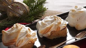 (8 pers.) ½ sandkage1 dl hindbærmarmelade1 liter vaniljeis5 æggehvider180 g sukkerSkær kagen igennem på langs og udstik 8 eller 16 små cirkler. Smør