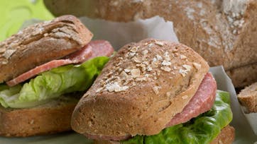 Smelt smørret og bland det med vand og mælk. Smuldr gæren i mælkeblandingen og rør det glat. Tilsæt rugmel og kerner og lad dejen hvile 10 min. Ælt hvedemel i og ælt dejen godt, til den har passende ikke for fast konsistens. Hæver lunt tildækket ca. 1½ time. Del dejen i 2 portioner og tril dem til pølser. Skær dem igennem på tværs, så der bliver 16 stykker. Tryk dem lidt flade og lad dem efterhæve tildækket på plade med bagepapir ca. 30 min. Spray med vand og klap lidt gryn på brødene. Bag dem på midterste rille ved 225° ca. 20 min.