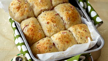 Skær skinken i strimler, rør gæren ud i vandet og tilsæt emmentaleren, oregano, salt, skinke og durummel. Tilsæt hvedemelet, ælt dejen sammen og stil den til hævning i 45 min. Form dejen til 9 ovale boller, sæt dem i en bradepande på 15 x 25 cm og lad dem efterhæve i 20 min. Pensl med vand og bag dem ved 200° i 25 min.