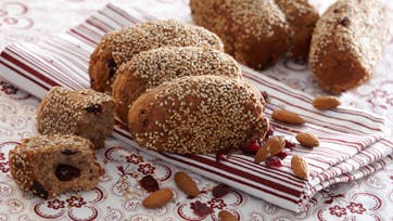 Bland speltgryn med sigtemel, klid, tranebær, mandler, natron og salt. Tilsæt yoghurt og tyttebær og rør dejen godt igennem. Smør en 1½ l brødform med smørret og kom sesamfrøene i en dyb tallerken. Del dejen i 8 og tril dem til aflange boller. Rul bollerne i sesamfrøene og læg dem ved siden af hinanden i brødformen. Bag brødene nederst i ovnen ved 200° i ca. 1 time og lad dem køle af under et viskestykke.
