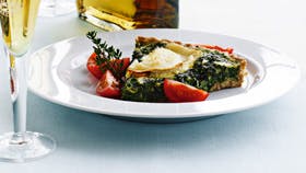 Bag tærten 20 min. ved 200° til spinaten er fast, og gedeosten er let gyldenbrun.